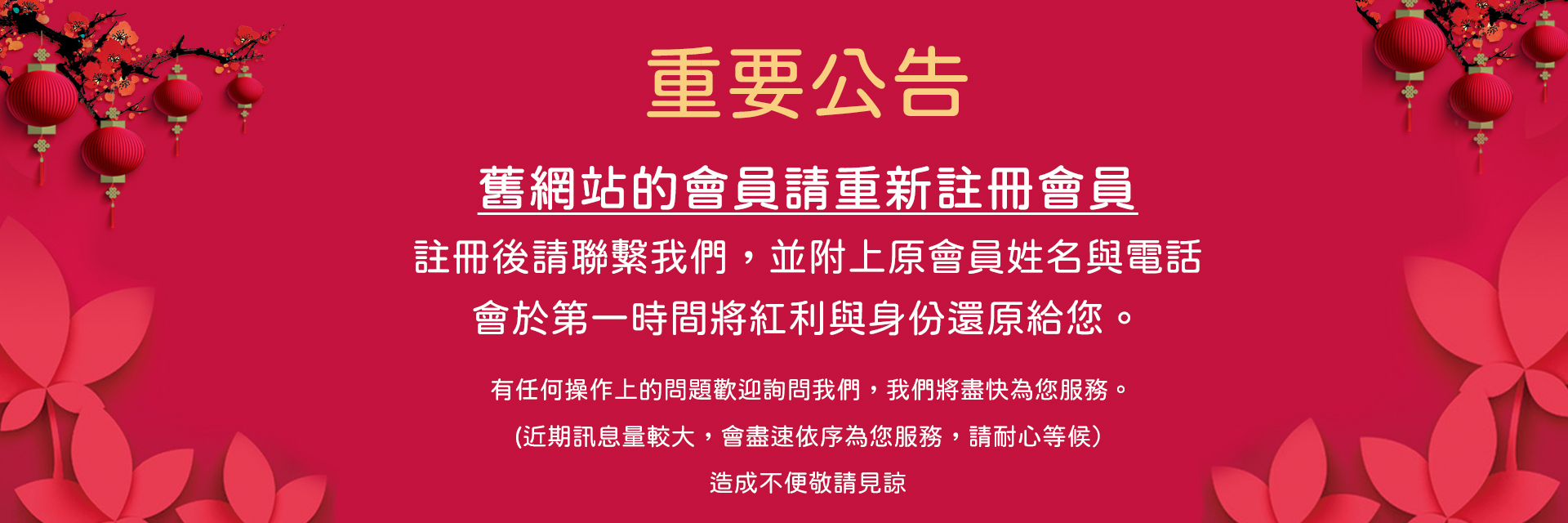 由於本網站更換新系統平台,所以舊的會員帳號無法繼續使用,請舊網站的會員在「新官網重新註冊會員」,我們將會為您還原「會員紅利」與「身分」。