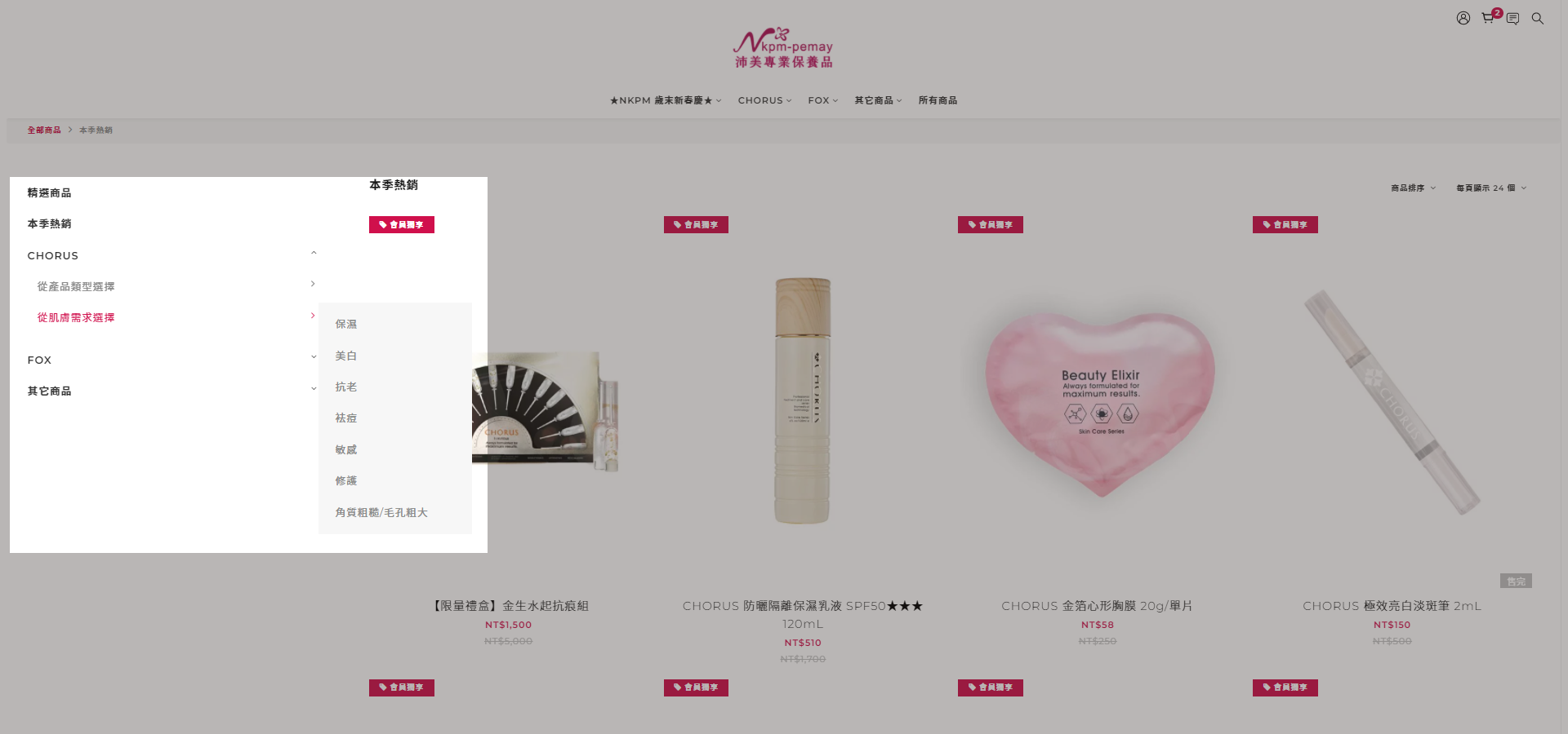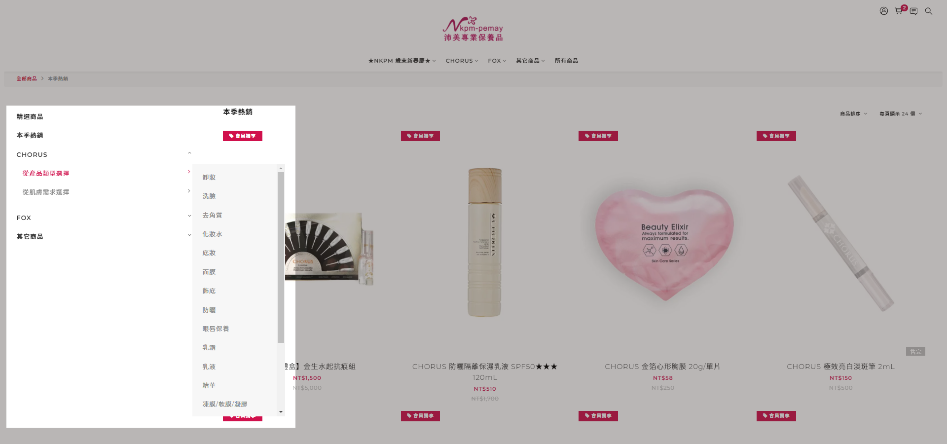 您可以利用沛美專業保養品官網上方及側邊之目錄選單,利用我們為您設定好的產品分類,依需求尋找商品。