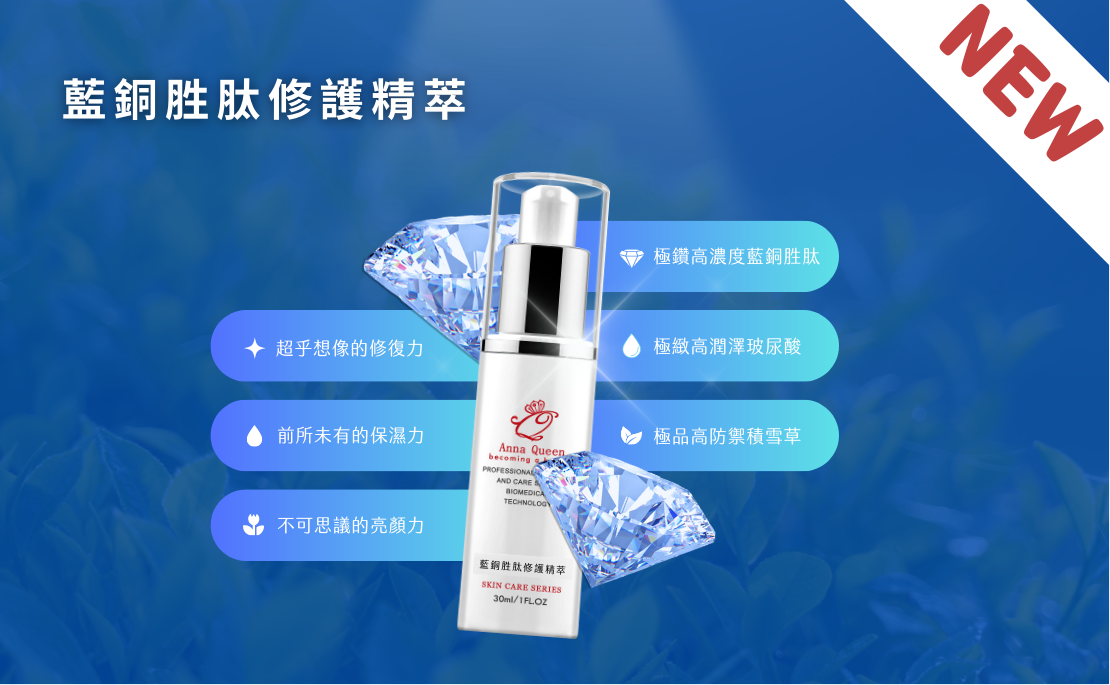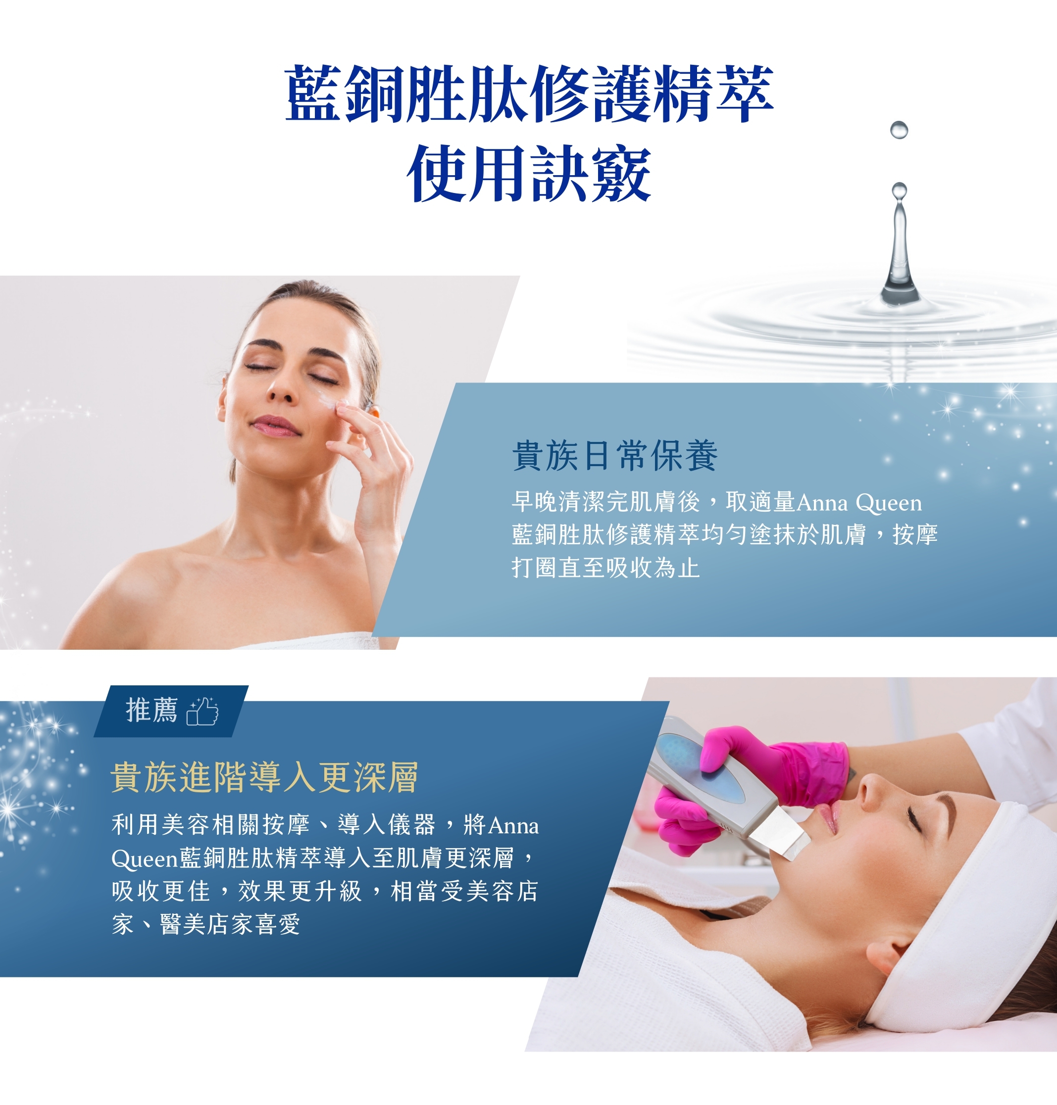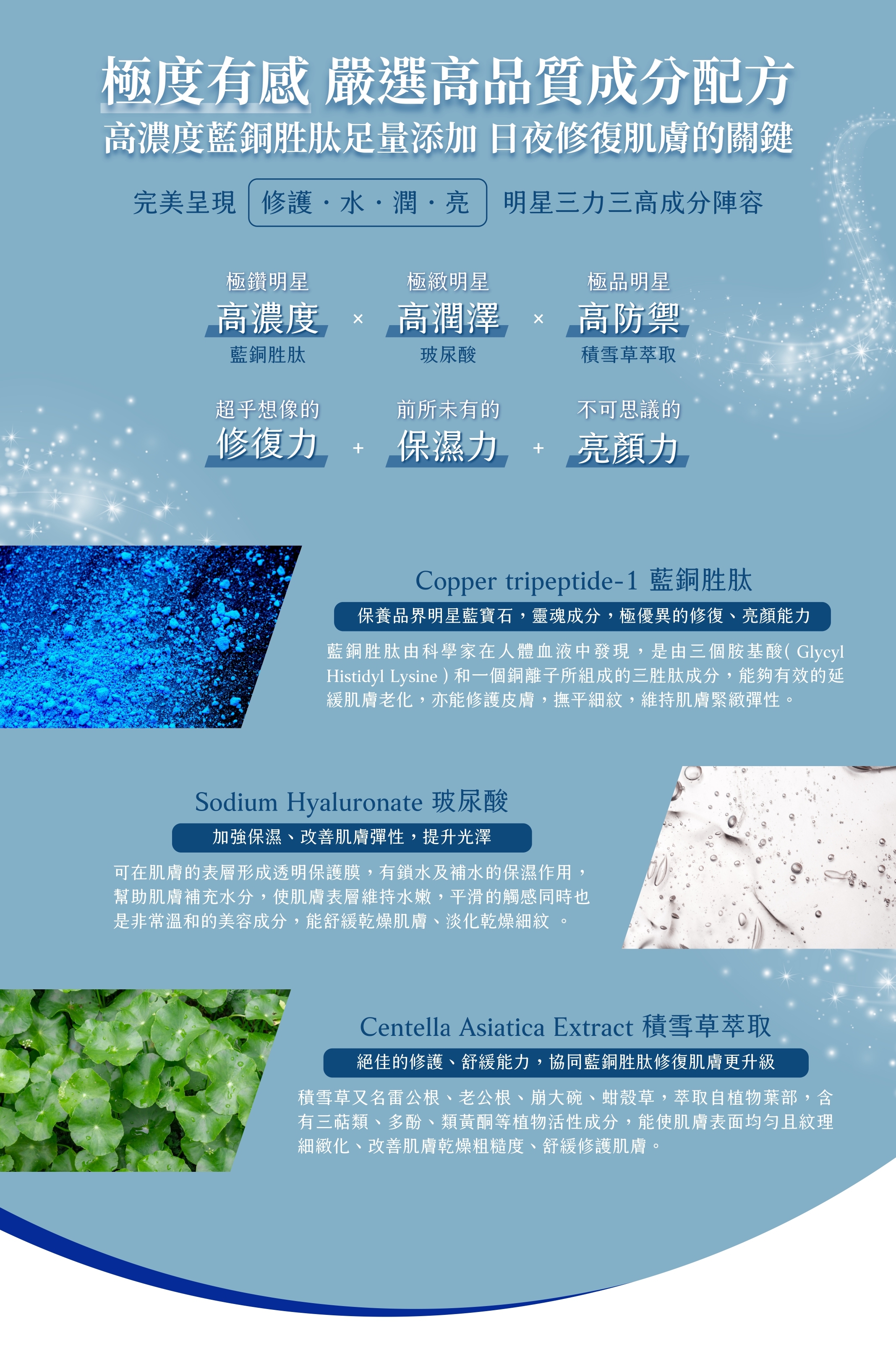 奢華頂級保養,蘊含高濃度藍銅胜肽,迅速修復肌膚,提升肌膚緊實度,溫和緩降肌齡,全方位延緩老化;由內而外修護受損肌膚,協助穩定燥進狀態,並形成護膚屏障,讓肌膚充滿青春光采。