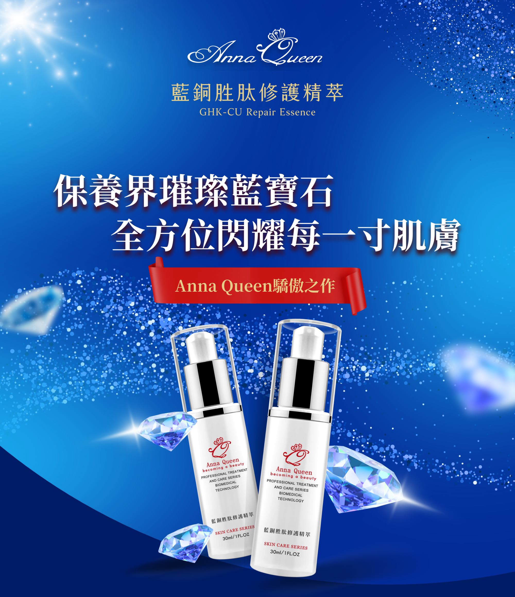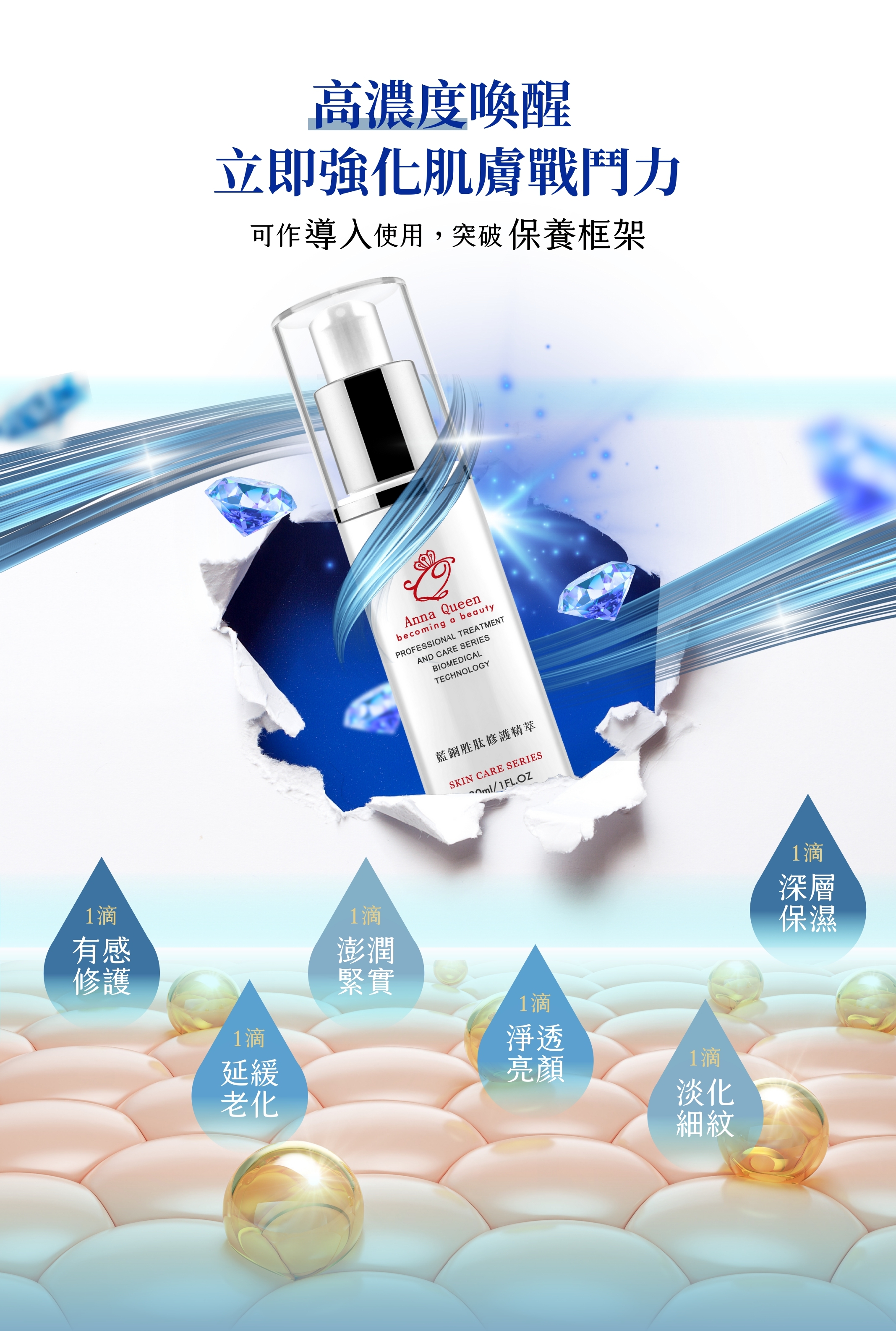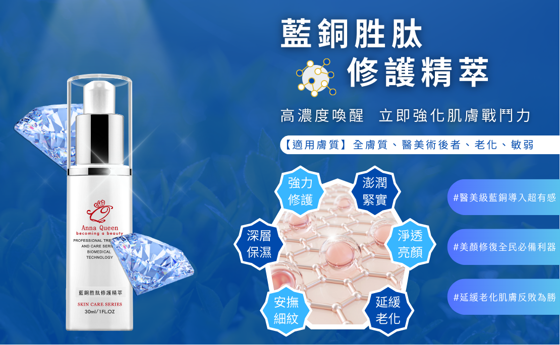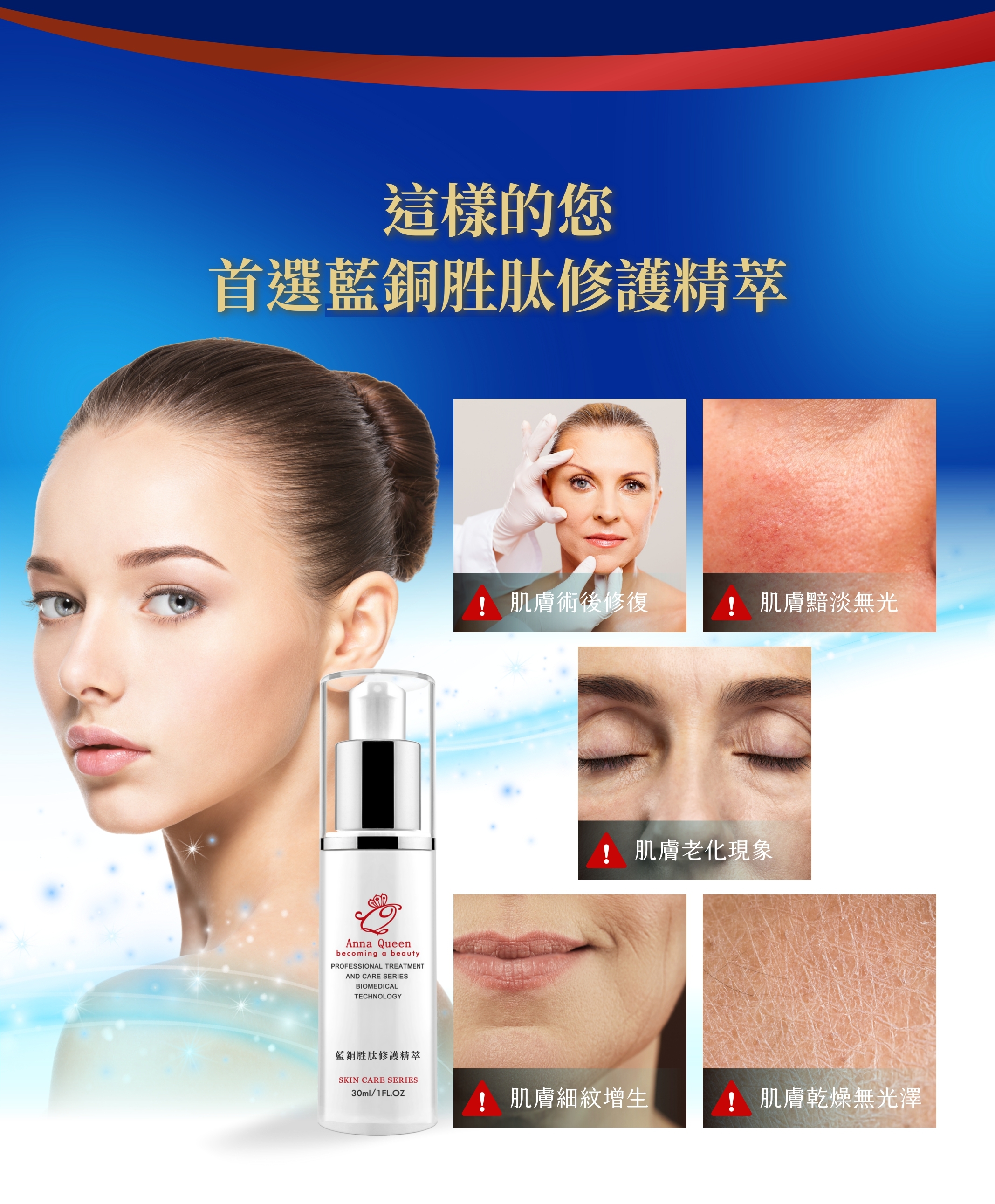 奢華頂級保養,蘊含高濃度藍銅胜肽,迅速修復肌膚,提升肌膚緊實度,溫和緩降肌齡,全方位延緩老化;由內而外修護受損肌膚,協助穩定燥進狀態,並形成護膚屏障,讓肌膚充滿青春光采。