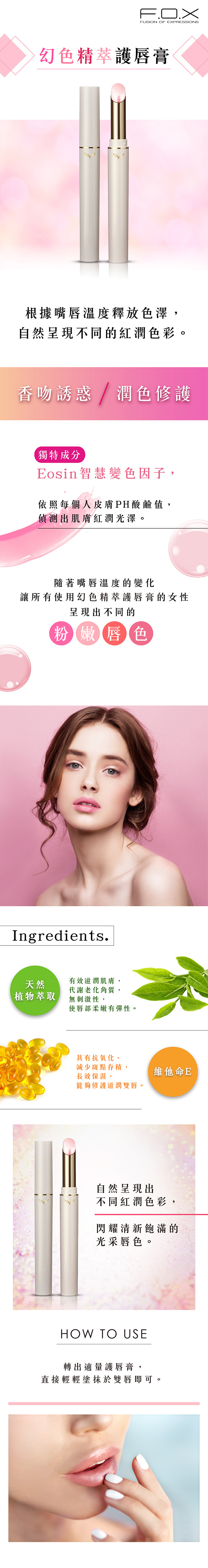 採用紅瓜果、羅勒花葉萃取物,及添加珊瑚藻及庫拉索蘆薈等保濕成份,能緊實、修護、嫩白雙脣,高度提升飽水及滋潤度。依據每個人唇部含水量,自然呈現不同粉潤唇色,適合各種唇色使用。